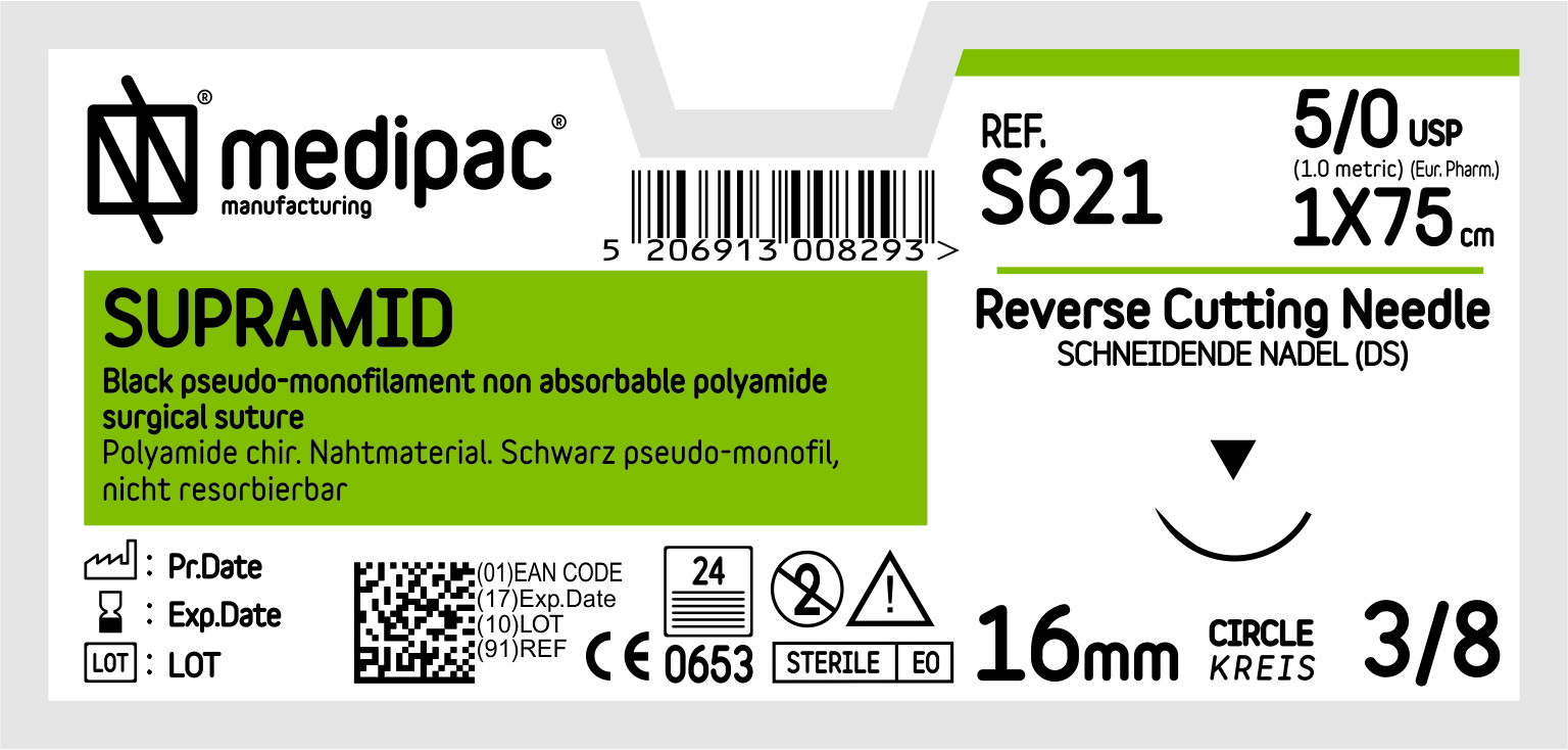 - Supramid monofilní materiál je vyroben z polyamidu 6 (PA6) v rozměrech od USP 6/0 do USP 5/0.