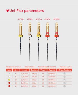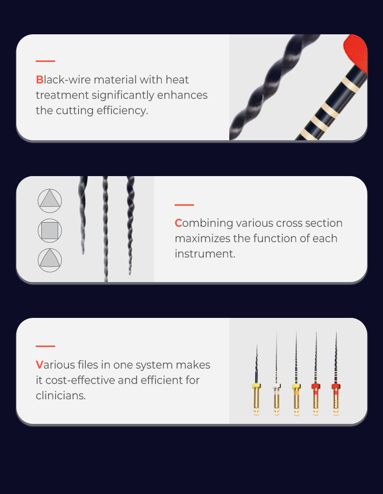 -vspeciální rotační systém s vysokou flexibilitou pro náročné anatomie tepelně upravená slitina Ni-Ti Black-wire variabilní průřezy jednotlivých nástrojů