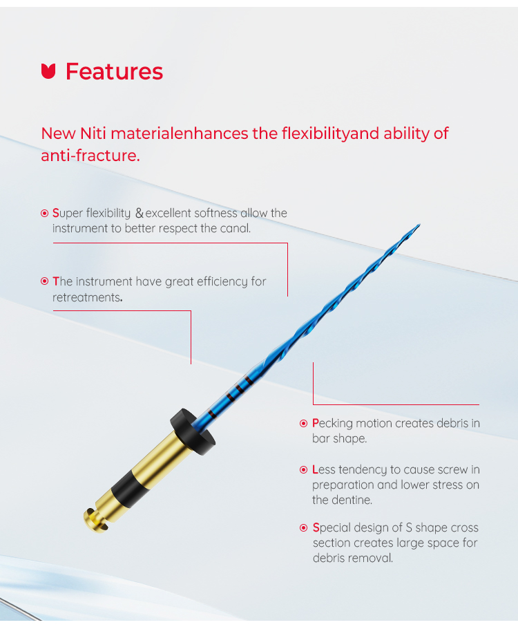 - reciproční Ni-Ti nástroje pro bezpečné a rychlé opracovávání speciální tepelná úprava nástroje s vyšší flexibilitou průřez nástroje S-shape a vysokou řeznou účinností