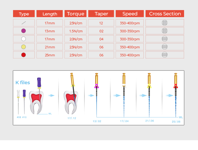 - rotační systém se speciální tepelnou úpravou Martenzitem vyníkající odolnost a flexibilita pro náročné anatomie komplexní řada od koronárního flaringu a glide-path až po ISO 50