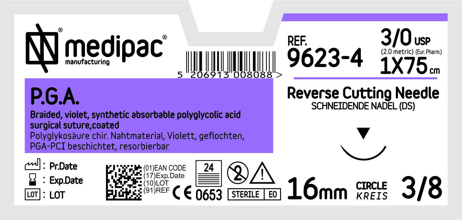 Chirurgické šití - P.G.A. - USP 3/0, EP 2.0, jehla řezná 3/8